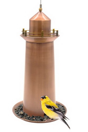 Brighten up your outdoor oasis with the Lighthouse Bird Feeder. The bold copper and brass finishes will bring birds by land and by sea to your backyard. With 3 perches and a 6-sided tray with 3 ports from which to feed, birds can feast from all angles. Spice up your sanctuary with a sense of seaside, by bringing this beachy bird feeder to your backyard. Simple by design, this feeder is hung with ease, and easy to fill. Removable top lifts for easy filling and drainage holes in the tray help keep seed dry.